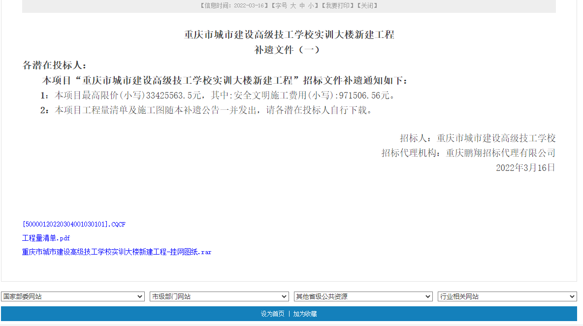 我公司凭借突出的业绩、雄厚的技术实力以及良好的市场信誉度于2022年3月11号成功中标中山市人民医院医联体基础设施(横栏片区)扩建工程,喜讯不断,于2022年3月16日又顺利中标重庆市城市建设高级技工学校实训大楼新建工程。